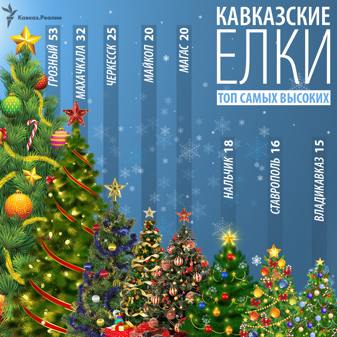 Во всех северокавказских регионах уже открылись главные елки. Отметим, грозненская и махачкалинская елки превзошли по высоте главную елку страны (30 метров).
