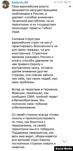 Кадыров отметил, что силовые структуры стран Европы не могут гарантировать безопасность "ни для своих граждан, ни для иностранных".