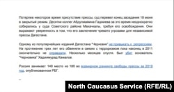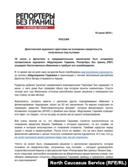 Следствие в деле редактора отдела "Религия" дагестанского еженедельника "Черновик" Абдулмумина Гаджиева не основано на убедительных вещественных уликах, в связи с чем журналист незамедлительно должен быть освобожден, заявлил руководитель отдела Восточной Европы и Центральной Азии "Репортеров без границ" Йоханн Бир.
