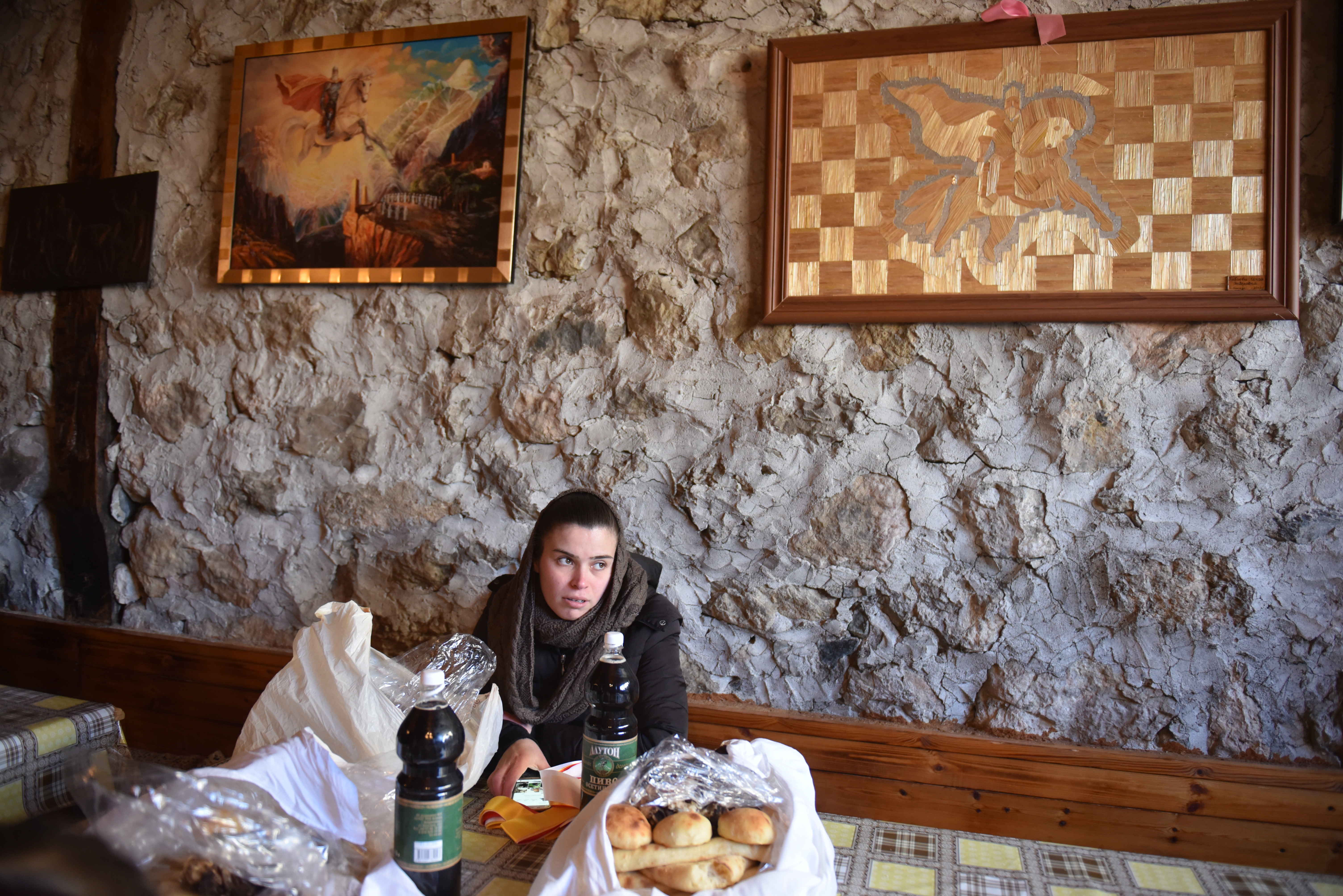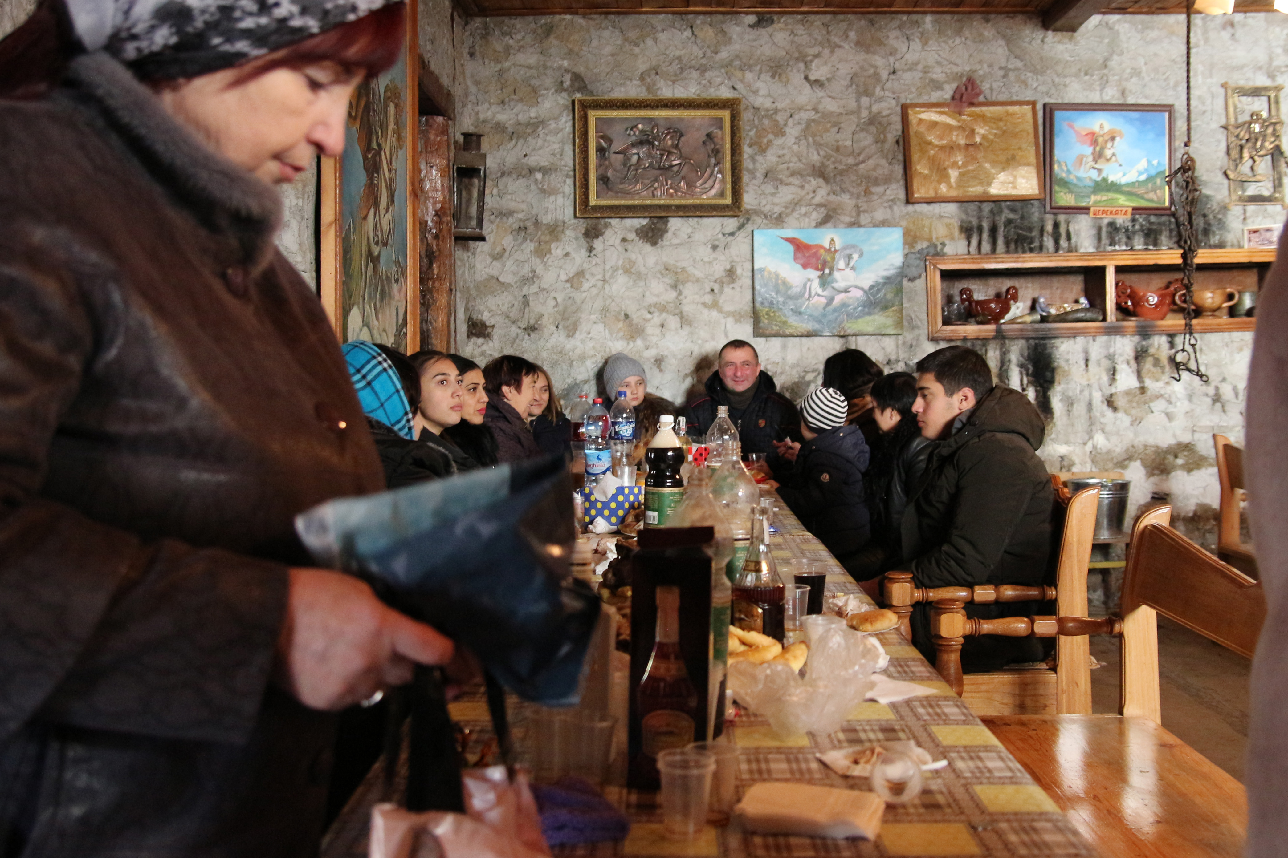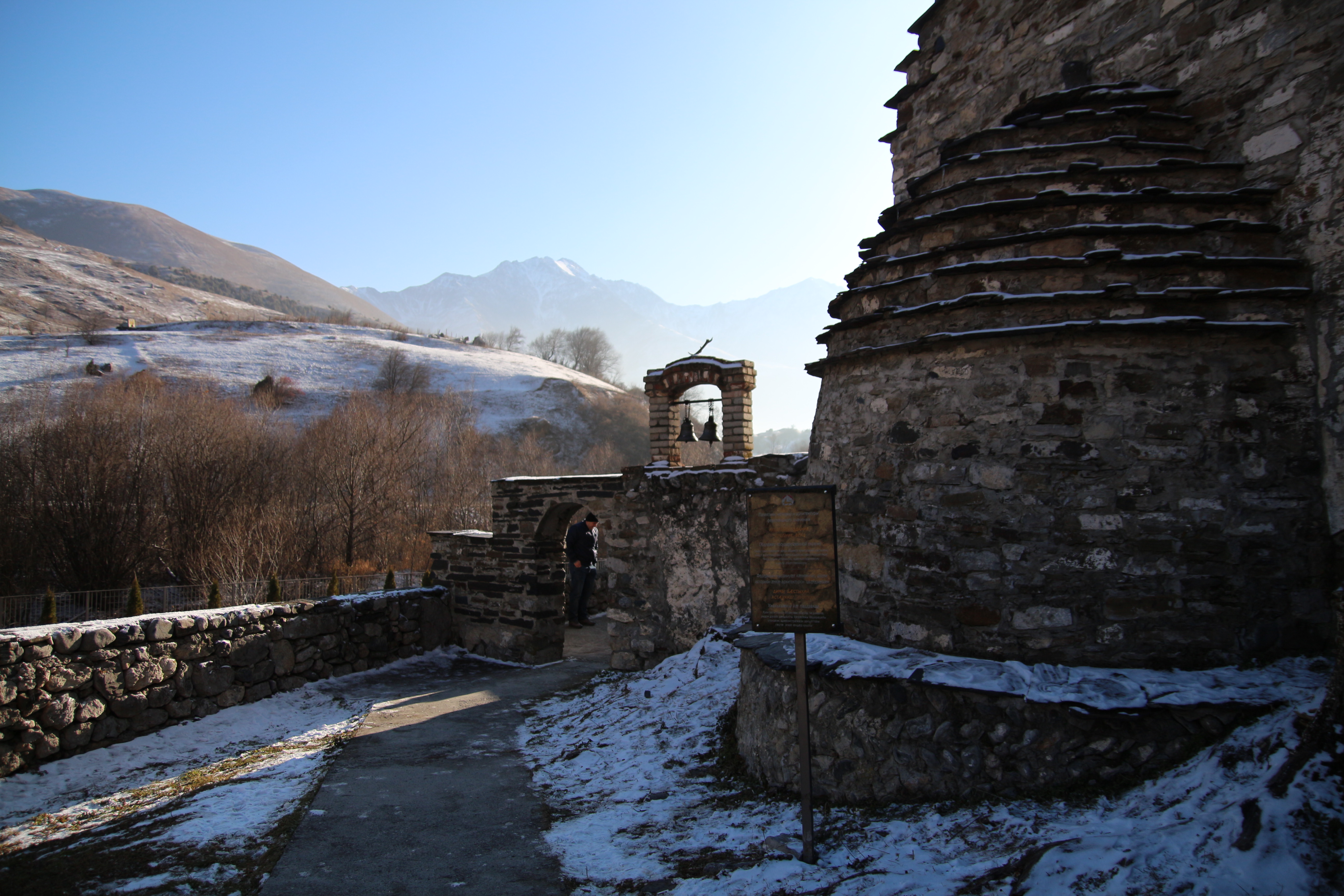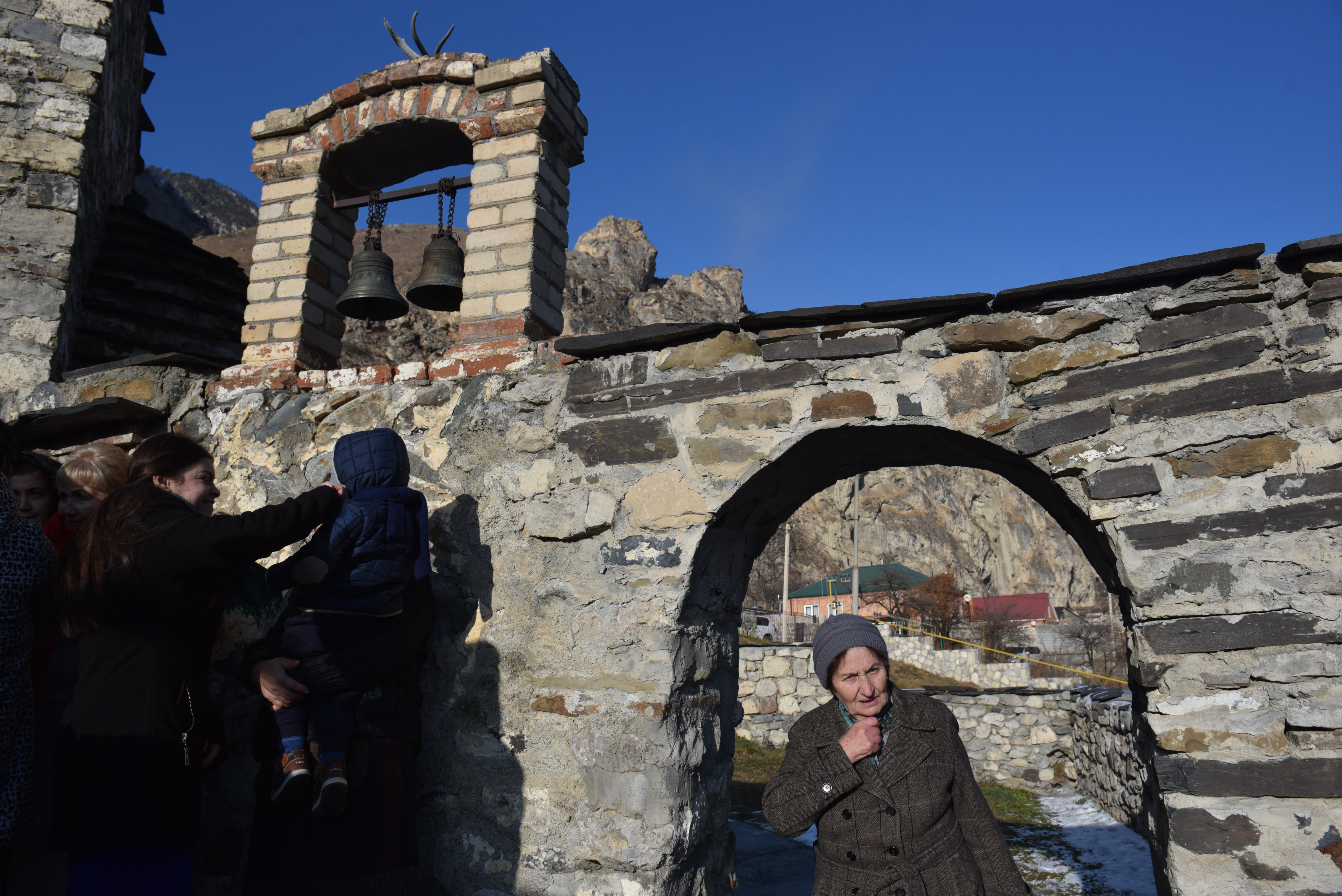Смотритель святилища Уастырджи Казбек Елканов встречает гостей. Он благословляет пришедших надочажной цепью – для осетин это предмет, имеющий сакральное значение.