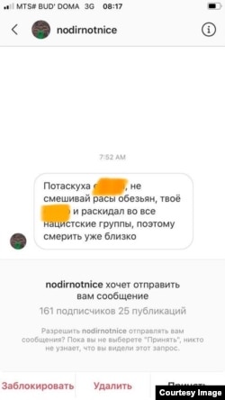 С расизмом в обычной жизни они почти не сталкивались, только Аниссу с Орфеем и его друзьями африканцами не пустили в ночной клуб после свадьбы – без объяснения причин. Обе они подверглись травле со стороны МГ. "Несколько сообщений были с угрозами жизни, – говорит Анна. – Мы тебя найдём, тебе не скрыться, мы тебя порежем. Не думаю, что кто-то из этих людей может прийти и убить, но за здоровье было реально страшно". "Писали: "чернильница", "шлюха", что я сплю с обезьяной, желали болезни и смерти не только мне, но и моим детям", – рассказывает Анисса. Вместе с оскорблениями приходило и много сообщений поддержки, противники МГ спорили с его сторонниками в комментариях, всё это превращалось в поток взаимных оскорблений. Анисса рассказывает, что нападавших на неё упрекали в том, что они прячутся за закрытыми профайлами, в итоге один из них открыл свою страницу, оказалось, что он работает в Росбанке. "Мои подписчики сразу обратились в банк, чтобы наказали этого человека. Банк попросил у меня прощения за него и сказали, примут это всё во внимание, потому что их филиалы есть и в Африке, и сотрудники должны быть толерантными”, – говорит Анисса.