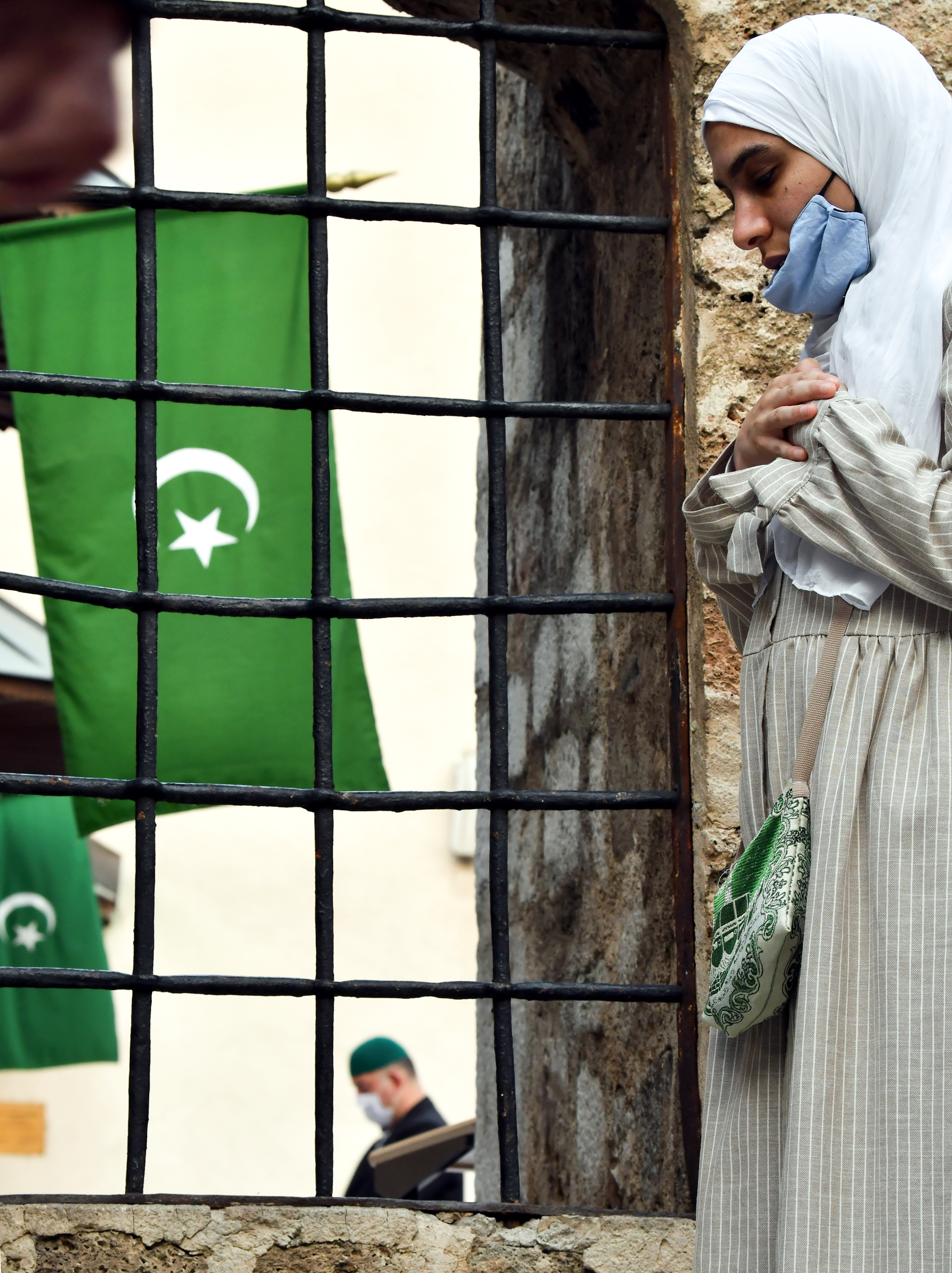 День начинается с праздничной молитвы. В ряде стран этому сопутствовали карантинные меры. Например, для входа в мечеть города Сараево в Боснии и Герцеговине этой девушке потребовалась маска.