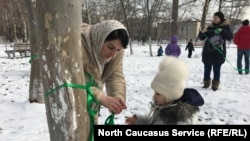 Некоторые участники акции пришли с детьми. Родители и дети в знак протеста против вырубки деревьев завязали на них зеленые ленты. “Плакаты и лозунги нам нельзя приносить, это уже считается “несанкционированным митингом”. Мы закон нарушать не собираемся, поэтому было решено провести такой небольшой флэш-моб с зелеными ленточками. Власти говорят, что мы кучка маргиналов, которые ничего не понимают или что у нас какие-то корыстные интересы. Спрашивают, почему мы молчали, когда в городе вырубались другие зеленые насаждения. Это не правда, что наши горожане не пытались защищать зеленые зоны от застройщиков, но силы их, к сожалению, оказывались неравными. Поэтому у многих нет веры в успех этих акций, потому люди не выходят, но мы будем продолжать, мы не собираемся отступать. Оставьте наш парк, он наш”, - заявила “Кавказ.Реалии” член инициативной группы противников вырубки деревьев в парке Ленинского комсомола, Мадина Ибрагимова.