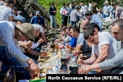 По тропинке к дзуару – осетинскому святилищу – поднимаются все новые мужчины, шлепая босыми ногами по камням. Холод и резь от мелких камушков мигом прогоняют сон. Паломники несут по три пирога с сыром – круглых или треугольных. Чтобы их испечь, женщинам полагается неделю поститься, а во время готовки надевать платок. Им самим вход на поляну запрещен – «для их же блага, иначе женские ангелы пострадают от мужских», как объясняет один из верующих. Поэтому они повязывают ленточки внизу, возле святилища поменьше. Кто-то уходит, другие ждут совместных танцев после мужского пира.